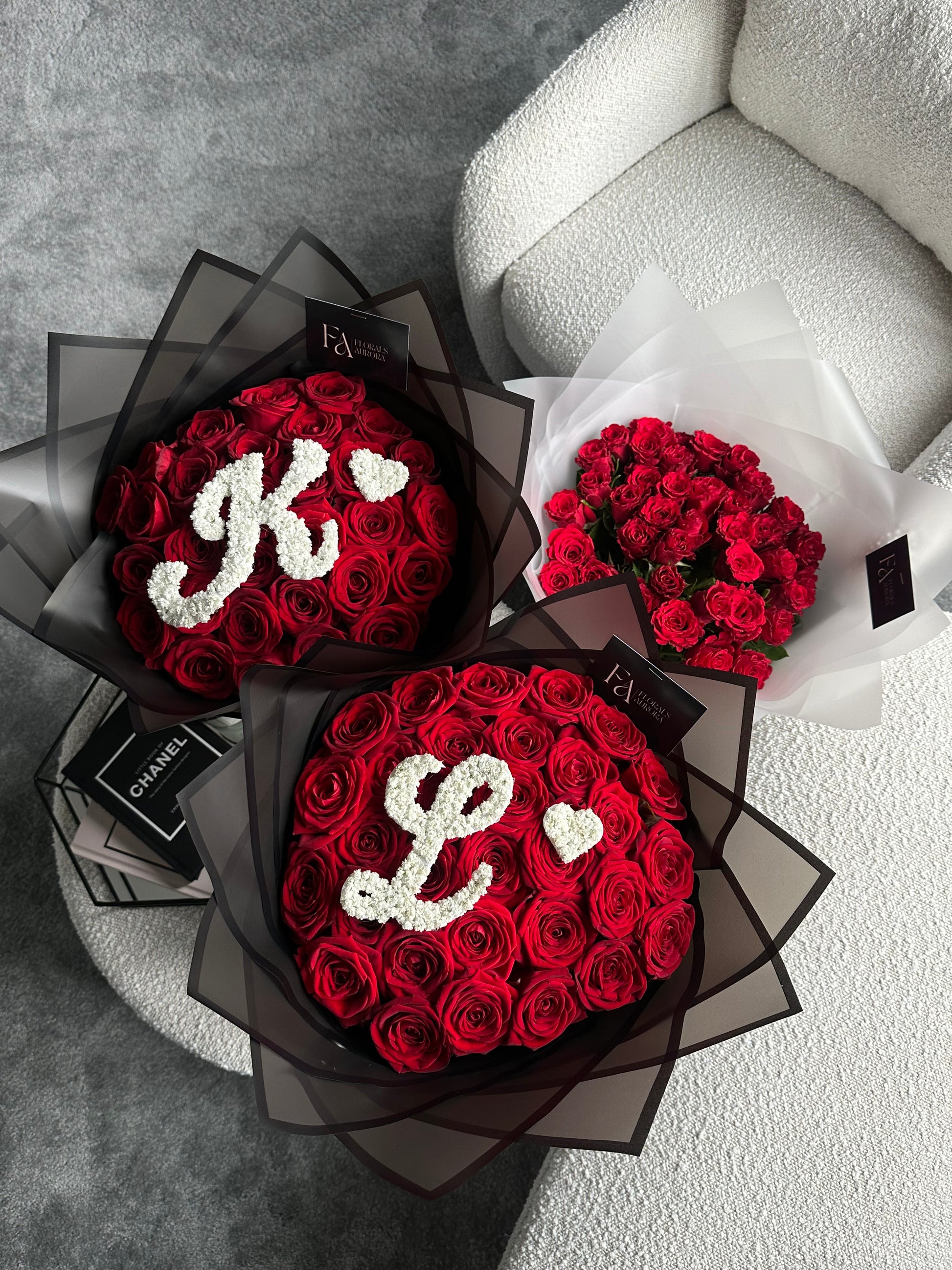 The Initial Bouquet features a refined arrangement of 20 to 100 red roses, expertly crafted and personalized with your selected initials.
